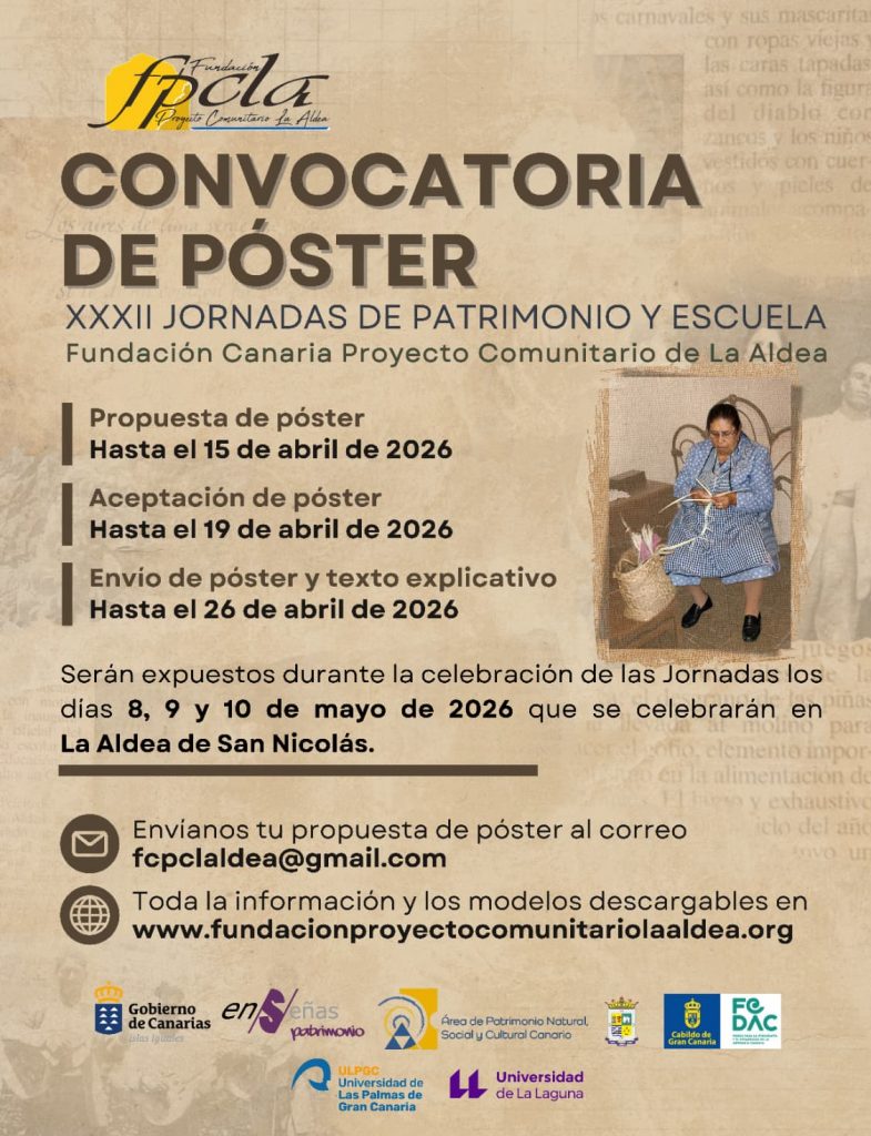 En caso de que el póster sea seleccionado, el artículo será publicado en una edición especial de la revista editada por la Fundación Canaria Proyecto Comunitario de La Aldea, dedicada a las XXXII Jornadas de Patrimonio y Escuela.